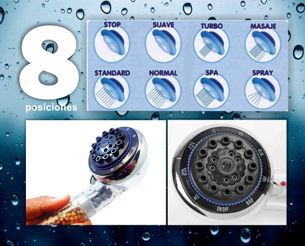8 tipos de chorro: soft, standard, normal, turbo, massage, spa, spray, stop (on/off)